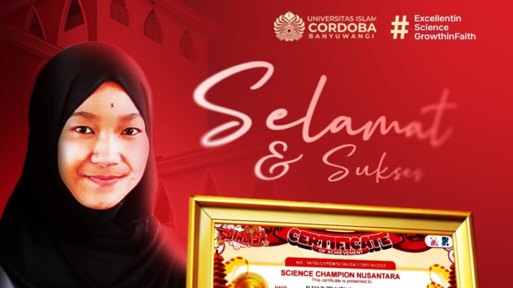 Banyuwangi — Prestasi membanggakan kembali ditorehkan oleh mahasiswa Universitas Islam Cordoba Banyuwangi. Elsya Putri Natalia, mahasiswi Program Studi Ilmu Al-Qur’an dan Tafsir, berhasil meraih Medali Emas Olimpiade Fisika dan Medali Perak Olimpiade Kimia pada ajang Science Champion Nusantara (SCINUSA) tingkat nasional.